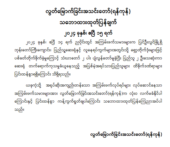 လွတ်မြောက်ခြင်းအသင်းတော် (ရန်ကုန်) သဘောထားထုတ်ပြန်ချက်