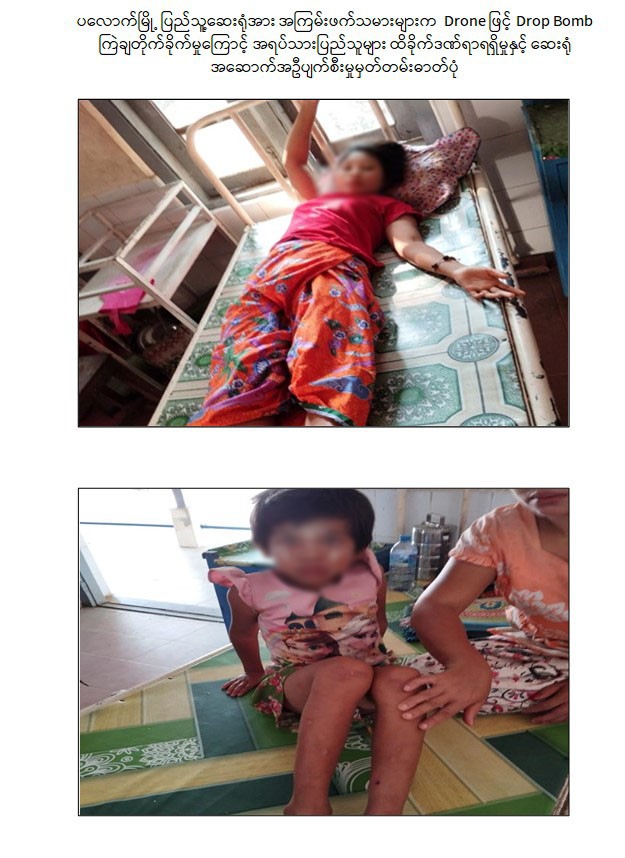 အထက်ပါဖြစ်စဉ်မှ ထိခိုက်ဒဏ်ရာရရှိသူများအား ပြည်သူ့ဆေးရုံ၌ ဆေးကုသမှု ခံယူစေလျက်ရှိကြောင်းနှင့် ယခုကဲ့သို့ ပြည်သူ့ဆေးရုံပေါ်သို့ Drop Bomb ပစ်ချ တိုက်ခိုက်ခြင်းသည် ဂျီနီဗာကွန်ဗန်းရှင်းနှင့် အပြည်ပြည်ဆိုင်ရာဥပဒေတို့အရ စစ်ရာဇဝတ်မှု (War Crime) ကို ကျူးလွန်ခြင်းဖြစ်ပြီး အဆိုပါအကြမ်းဖက်မှုကို ကျူးလွန်ခဲ့သည့် အကြမ်းဖက်သမားများအား အမြန်ဆုံးဖော်ထုတ်ဖမ်းဆီး၍ ဥပဒေနှင့်အညီ အပြစ်ပေးအရေးယူနိုင်ရေး ဆက်လက်ဆောင်ရွက်လျက်ရှိကြောင်း သတင်းရရှိသည်။