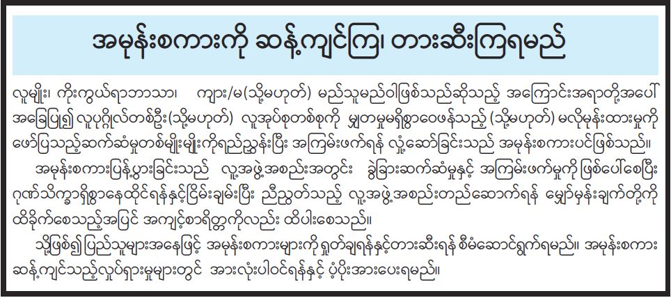သို့ဖြစ်၍ ပြည်သူများအနေဖြင့် အမုန်းစကားများကို ရှုတ်ချရန်နှင့်တားဆီးရန် စီမံဆောင်ရွက်ရမည်။ အမုန်းစကားဆန့်ကျင်သည့် လှုပ်ရှားမှုများတွင် အားလုံးပါဝင်ရန်နှင့် ပံ့ပိုးအားပေးရမည်။