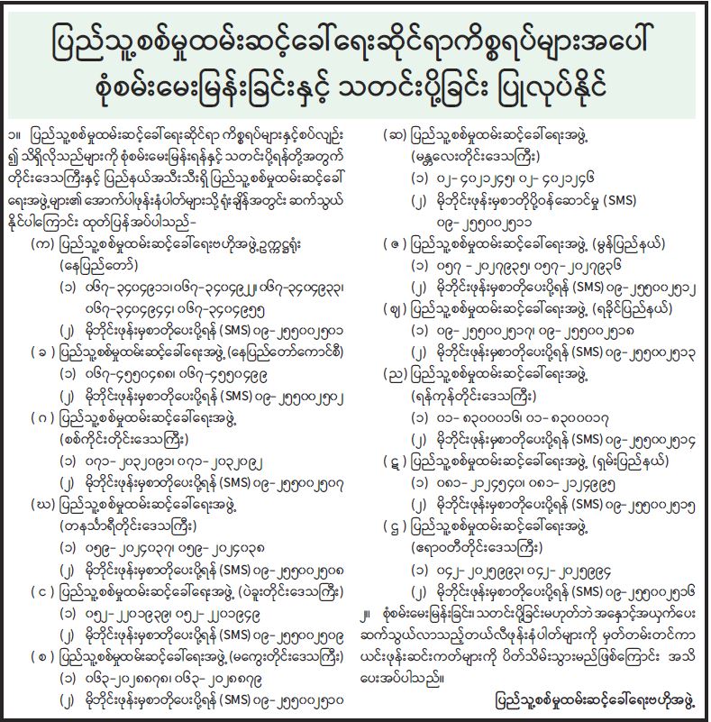 ၁။ ပြည်သူ့စစ်မှုထမ်းဆင့်ခေါ်ရေးဆိုင်ရာ ကိစ္စရပ်များနှင့်စပ်လျဉ်း၍ သိရှိလိုသည်များကို စုံစမ်းမေးမြန်းရန်နှင့် သတင်းပို့ရန်တို့အတွက် တိုင်းဒေသကြီးနှင့် ပြည်နယ်အသီးသီးရှိ ပြည်သူ့စစ်မှုထမ်းဆင့်ခေါ်ရေးအဖွဲ့များ၏ အောက်ပါဖုန်းနံပါတ်များသို့ ရုံးချိန်အတွင်း ဆက်သွယ်နိုင်ပါကြောင်း ထုတ်ပြန်အပ်ပါသည်-