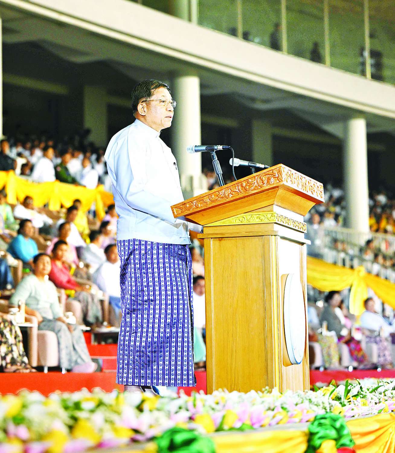 ယနေ့အချိန်အခါတွင် မိမိတို့နိုင်ငံသည် ပြည်တွင်း၊ ပြည်ပအန္တရာယ်များ ဝင်ရောက်စွက်ဖက်မှုများဖြင့် ကြုံတွေ့နေရချိန်ဖြစ်ကြောင်း၊ မိမိတို့နိုင်ငံသာမက မဟာဗျူဟာအချက်အချာကျသည့် ကမ္ဘာ့နိုင်ငံငယ်အများစုသည်လည်း ယင်းအခြေအနေနှင့် ကြုံနေရကြောင်း၊ ထိုကဲ့သို့အဘက်ဘက်မှ ထိုးနှက်တိုက်ခိုက်နေမှုများအပေါ် ပြည်သူလူထု၊ အစိုးရ၊ တပ်မတော်တို့၏ ပေါင်းစည်းအား၊ ညီညွတ်သောစိတ်ဓာတ်တို့ဖြင့် ကာကွယ်ရန်လိုကြောင်း၊ အထူးအလေးအနက်ထား ပြောကြားလိုသည်မှာ ထိုကဲ့သို့ အခက်အခဲများအကြား နိုင်ငံ၏နေရာဒေသအသီးသီးတွင် တာဝန်ထမ်းဆောင်နေကြသည့် တပ်မတော်သားများ၊ မြန်မာနိုင်ငံရဲတပ်ဖွဲ့ဝင်များ၊ နိုင်ငံ့ဝန်ထမ်းများ၏ နိုင်ငံတော်နှင့် ပြည်သူလူထုအတွက် တာဝန်ထမ်းဆောင်နေမှုများကို အသိအမှတ်ပြုဂုဏ်ပြုပါကြောင်းကို ပြောကြားလိုကြောင်း၊ တစ်မျိုးသားလုံးနှင့်သက်ဆိုင်သည့်၊ အမျိုးသားရေးကြံ့ခိုင်မှုနှင့် စိတ်ဓာတ်ခွန်အားကိုတိုးတက်စေမည့် ယခုအမျိုးသားအားကစားပွဲတော်ကြီးကို ယခုကဲ့သို့ ကျင်းပနိုင်၊ စုစည်းနိုင်ခဲ့ခြင်းမှာလည်း မိမိတို့နိုင်ငံကို လုံခြုံအောင်ကာကွယ်ပေးနေသည့် သူရဲကောင်းများရှိနေခြင်းကြောင့်ပင်ဖြစ်ကြောင်း၊ ထို့ကြောင့် မိမိတို့နိုင်ငံ၊ မိမိတို့လူမျိုး၊ မိမိတို့ပြည်သူများကိုကာကွယ်ရင်း အသက်ပေးလှူ ကျဆုံးသွားခဲ့ရသည့် တပ်မတော်သားများ၊ မြန်မာနိုင်ငံရဲတပ်ဖွဲ့ဝင်များ၊ ပြည်သူ့စစ်မှုထမ်းအဖွဲ့ဝင်များ၊ နိုင်ငံ့ဝန်ထမ်းများ၊ အခြားနိုင်ငံ့သားကောင်းများအားလုံးကို အထူးအလေးထား ဦးညွှတ်ဂုဏ်ပြုမှတ်တမ်းတင်ပါကြောင်းကို ပြောကြားလိုကြောင်း။