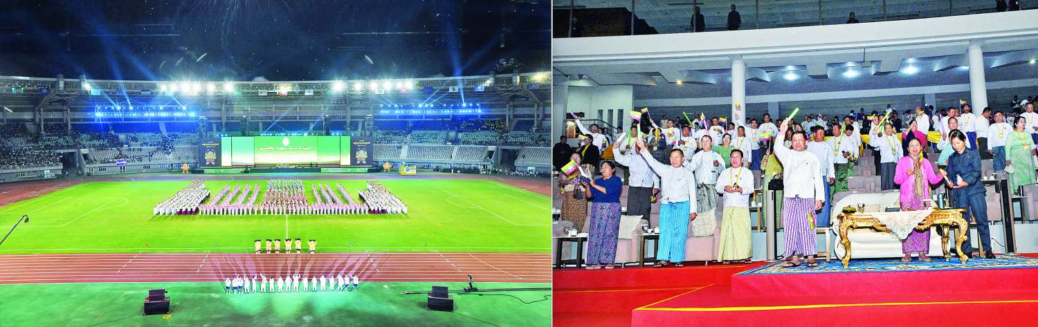 ၂ဝ၂၄ ခုနှစ်၊ ပဉ္စမအကြိမ်မြောက် အမျိုးသားအားကစားပွဲတော် ပိတ်ပွဲအခမ်းအနားကို ယနေ့ညနေပိုင်းတွင် နေပြည်တော်ရှိ ဝဏ္ဏသိဒ္ဓိအားကစားကွင်း၌ ကျင်းပပြုလုပ်ရာ နိုင်ငံတော်စီမံအုပ်ချုပ်ရေးကောင်စီဥက္ကဋ္ဌ နိုင်ငံတော်ဝန်ကြီးချုပ် ဗိုလ်ချုပ်မှူးကြီး မင်းအောင်လှိုင် တက်ရောက်ချီးမြှင့်ပြီး ဂုဏ်ပြုအမှာစကားပြောကြားသည်။