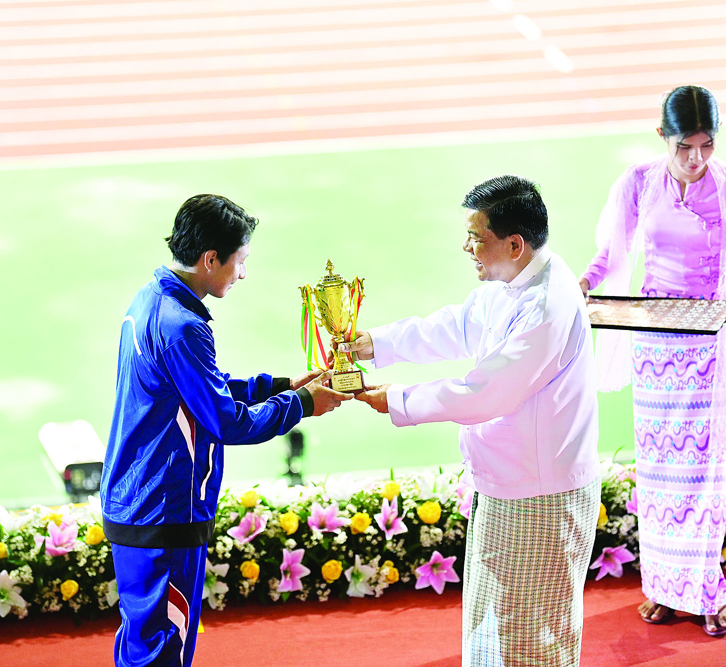 ဆက်လက်၍ နိုင်ငံတော်စီမံအုပ်ချုပ်ရေးကောင်စီဥက္ကဋ္ဌ နိုင်ငံတော်ဝန်ကြီးချုပ် ဗိုလ်ချုပ်မှူးကြီး မင်းအောင်လှိုင်က ပြည်နယ်နှင့်တိုင်းဒေသကြီးအဆင့် မသန်စွမ်းအားကစားပြိုင်ပွဲတွင် တံခွန်စိုက်ဆုဖလားရရှိသော ဧရာဝတီတိုင်းဒေသကြီးကို တံခွန်စိုက်ဆုဖလားကြီးကိုလည်းကောင်း၊ ပြည်နယ်နှင့်တိုင်းဒေသကြီးအဆင့် အားကစားပြိုင်ပွဲတွင် တံခွန်စိုက်ဆုဖလားရရှိသော ရန်ကုန်တိုင်းဒေသကြီးကို တံခွန်စိုက်ဆုဖလားကြီးကိုလည်းကောင်း၊ ဝန်ကြီးဌာနအဆင့် အားကစားပြိုင်ပွဲတွင် တံခွန်စိုက်ဆုဖလားရရှိသော ကာကွယ်ရေးဝန်ကြီးဌာနကို တံခွန်စိုက်ဆုဖလားကြီးကိုလည်းကောင်း ပေးအပ်ချီးမြှင့်သည်။