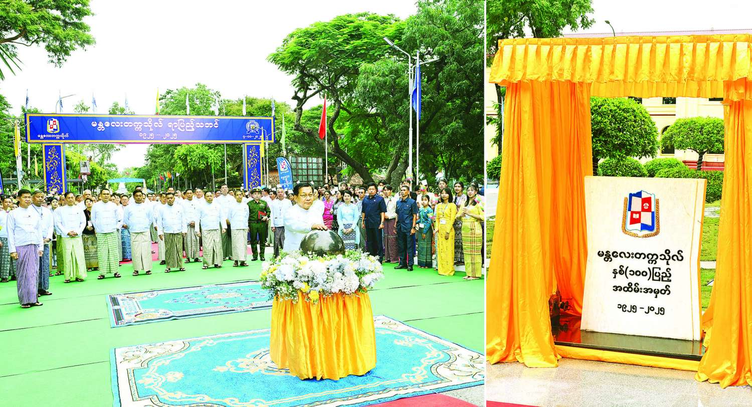 မန္တလေးတက္ကသိုလ်နှစ်(၁၀၀)ပြည့် ရာပြည့်သဘင်အထိမ်းအမှတ် ဖွင့်ပွဲအခမ်းအနားကို ယနေ့နံနက်ပိုင်းတွင်ကျင်းပပြုလုပ်ရာ ပြည်ထောင်စုသမ္မတမြန်မာနိုင်ငံတော် ယာယီသမ္မတ နိုင်ငံတော်လုံခြုံရေးနှင့်အေးချမ်းသာယာရေးကော်မရှင်ဥက္ကဋ္ဌ ဗိုလ်ချုပ်မှူးကြီး မင်းအောင်လှိုင် တက်ရောက်ချီးမြှင့်သည်။