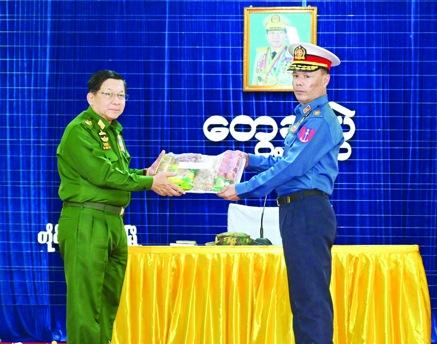 ယင်းနောက် နိုင်ငံတော်လုံခြုံရေးနှင့်အေးချမ်းသာယာရေးကော်မရှင်ဥက္ကဋ္ဌ တပ်မတော်ကာကွယ်ရေးဦးစီးချုပ်က အရာရှိ၊ စစ်သည်၊ မိသားစုများအတွက်စားသောက် ဖွယ်ရာပစ္စည်းများကိုပေးအပ်ရာ တပ်နယ်မှူးက လက်ခံရယူသည်။