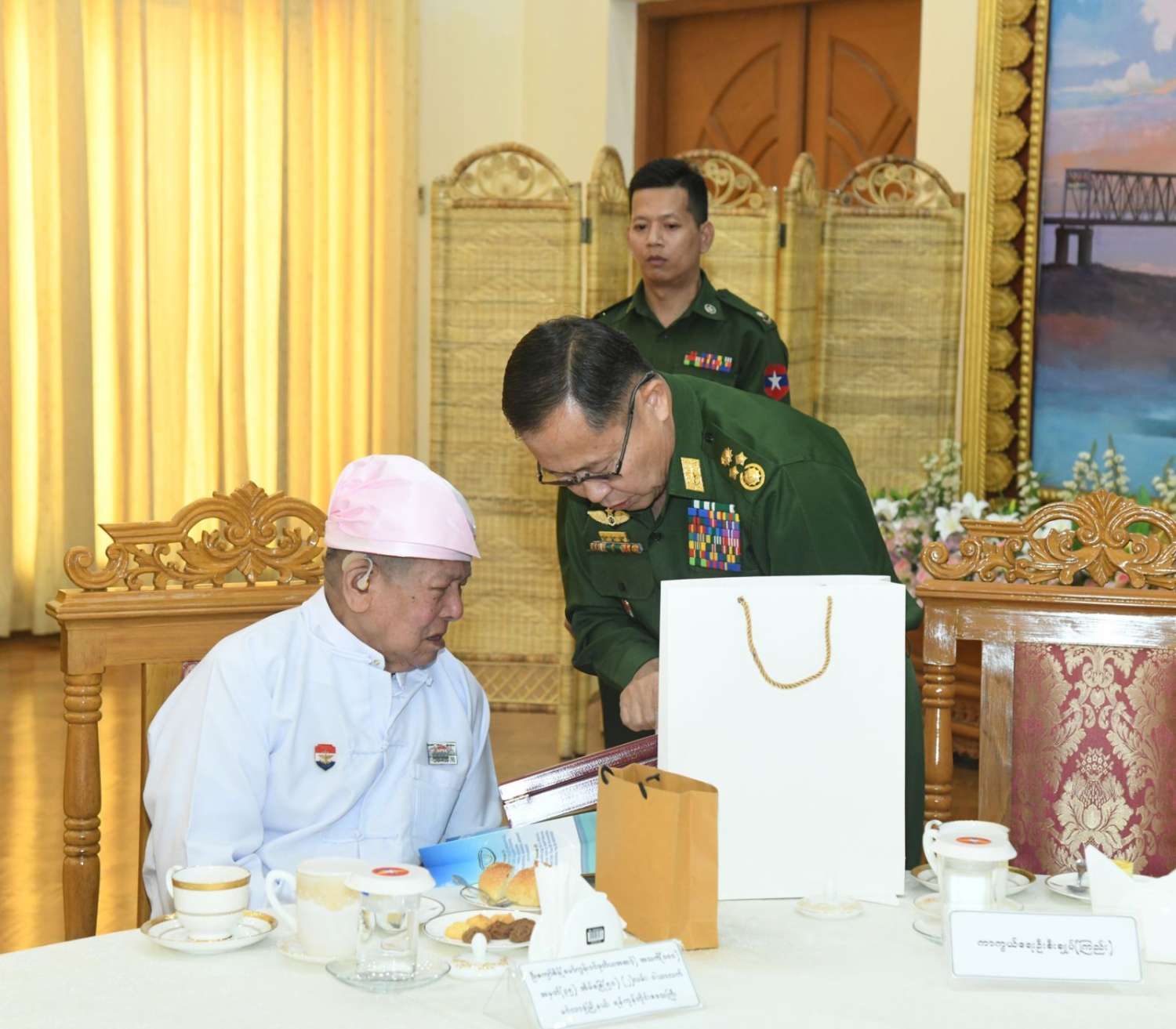 (၈၁) နှစ်မြောက် တပ်မတော်နေ့စစ်ရေးပြအခမ်းအနားသို့ တက်ရောက်ကြမည့် လွတ်လပ်ရေးမော်ကွန်းဝင်ပုဂ္ဂိုလ် ဒုတိယအဆင့် ၁ ဦးနှင့် တတိယအဆင့် ၂ ဦး စုစုပေါင်း ၃ ဦးတို့အား နိုင်ငံတော်လုံခြုံရေးနှင့် အေးချမ်းသာယာရေးကော်မရှင် ဒုတိယဥက္ကဋ္ဌ ဒုတိယတပ်မတော်ကာကွယ်ရေးဦးစီးချုပ် ဒုတိယဗိုလ်ချုပ်မှူးကြီး စိုးဝင်းက ယနေ့ နံနက်ပိုင်းတွင် နေပြည်တော်ရှိ ဘုရင့်နောင်ရိပ်သာ ဧည့်ခန်းမဆောင်၌ လက်ဘက်ရည်ဝိုင်းဖြင့် တည်ခင်းဧည့်ခံ၍ ဂါရဝပြုတွေ့ဆုံသည်။