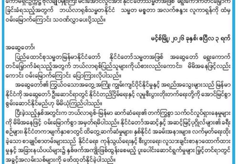 ပြည်ထောင်စုသမ္မတမြန်မာနိုင်ငံတော် ယာယီသမ္မတ နိုင်ငံတော်လုံခြုံရေးနှင့် အေးချမ်းသာယာရေးကော်မရှင်ဥက္ကဋ္ဌ ဗိုလ်ချုပ်မှူးကြီး မင်းအောင်လှိုင်အား နိုင်ငံတော်သမ္မတအဖြစ် ရွေးကောက်တင်မြှောက်ခြင်းခံရသည့်အတွက် ရုရှားဖက်ဒရေးရှင်းနိုင်ငံ သမ္မတ မစ္စတာ ဗလာဒီမာပူတင် ထံမှ ဝမ်းမြောက်ကြောင်းသဝဏ်လွှာပေးပို့