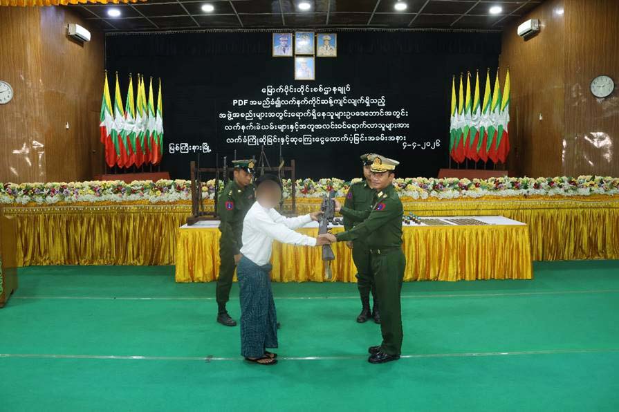 နိုင်ငံတော်အစိုးရသည် PDF အပါအဝင် အဖွဲ့အစည်းအမျိုးမျိုးအမည်ခံ၍ လက်နက်ကိုင်ဆန့်ကျင်လျက်ရှိသည့် အဖွဲ့အစည်းများအတွင်း ရောက်ရှိနေသူများအား ဥပဒေဘောင်အတွင်းသို့ ပြန်လည်ဝင်ရောက်ရန်ဖိတ်ခေါ်၍ ဥပဒေဘောင်အတွင်းသို့ ပြန်လည်ဝင်ရောက်လာကြသူများကိုလည်း လိုအပ်သည့် ကူညီပံ့ပိုးမှုများ ဆောင်ရွက်ပေးလျက်ရှိရာ နိုင်ငံတော်နှင့် တပ်မတော်၏ငြိမ်းချမ်းရေးလုပ်ငန်းစဉ်များကို နားလည်သဘောပေါက်လာသည့် KIA KPDF နှင့် PDF အမည်ခံအဖွဲ့မှ အဖွဲ့ဝင်အမျိုးသား ၈ ဦးတို့သည် လက်နက်ခဲယမ်းများနှင့်အတူ ဥပဒေဘောင်အတွင်းသို့ ထပ်မံဝင်ရောက်လာကြသည်။