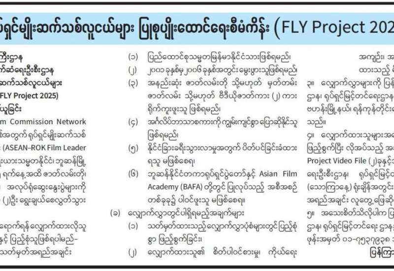 ၂၀၂၅ ခုနှစ်အတွက် ရုပ်ရှင်မျိုးဆက်သစ်လူငယ်များ ပြုစုပျိုးထောင်ရေးစီမံကိန်း (FLY Project 2025) လျှောက်လွှာခေါ်ယူ