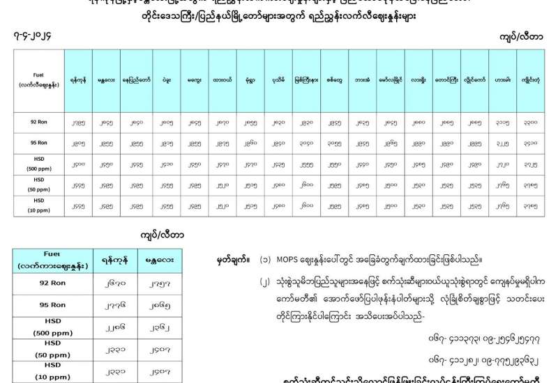 ရန်ကုန်မြို့နှင့် မန္တလေးမြို့အတွက် ရည်ညွှန်းလက်ကားဈေးနှုန်းများနှင့် ပြည်ထောင်စုနယ်မြေ နေပြည်တော်၊ တိုင်းဒေသကြီး/ ပြည်နယ် မြို့တော်များအတွက် ရည်ညွှန်းလက်လီဈေးနှုန်းများ