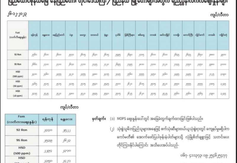 ရန်ကုန်မြို့နှင့် မန္တလေးမြို့အတွက် ရည်ညွှန်းလက်ကားဈေးနှုန်းများနှင့် ပြည်ထောင်စုနယ်မြေ နေပြည်တော်၊ တိုင်းဒေသကြီး/ပြည်နယ် မြို့တော်များအတွက် ရည်ညွှန်းလက်လီဈေးနှုန်းများ