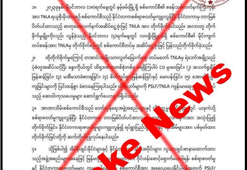 ရှမ်းပြည်နယ်(မြောက်ပိုင်း)၊ နမ့်ခမ်းမြိုနယ်ရှိ စခန်းသစ်လုံခြုံရေး စခန်းအား TNLA အဖွဲ့နှင့် PDF အမည်ခံအကြမ်းဖက်သမားများက တိုက်ခိုက်လျက်ရှိပြီး တပ်မတော်မှ နယ်မြေဒေသ လုံခြုံရေးနှင့် တရားဉပဒေ စိုးမိုးရေးအတွက် လိုအပ်သော လုံခြုံရေးလုပ်ငန်းများကို ဆောင်ရွက်လျက်ရှိရာ တပ်မတော်မှ အဆိပ်ငွေ့ဗုံးများဖြင့် တိုက်ခိုက်လာခဲ့သည်ဟု TNLA အဖွဲ့မှ မဟုတ်မမှန် သတင်းထုတ်ပြန် ချက်တစ်ခုကို Online မီဒီယာများတွင် ဖြန့်ဝေလျက်ရှိသည်ကို တွေ့ရှိရသည်။