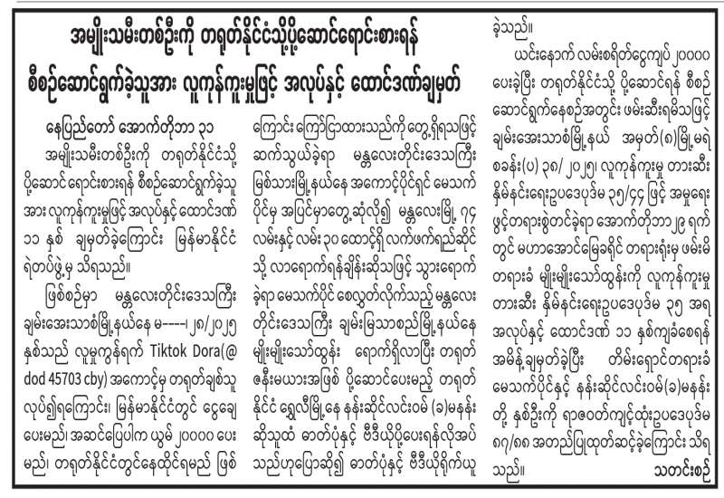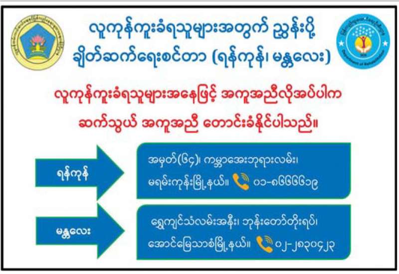 လူကုန်ကူးခံရသူများအတွက် ညွှန်းပို့ချိတ်ဆက်ရေးစင်တာ(ရန်ကုန်၊ မန္တလေး)တို့သို့ ဆက်သွယ်အကူအညီတောင်းခံနိုင်