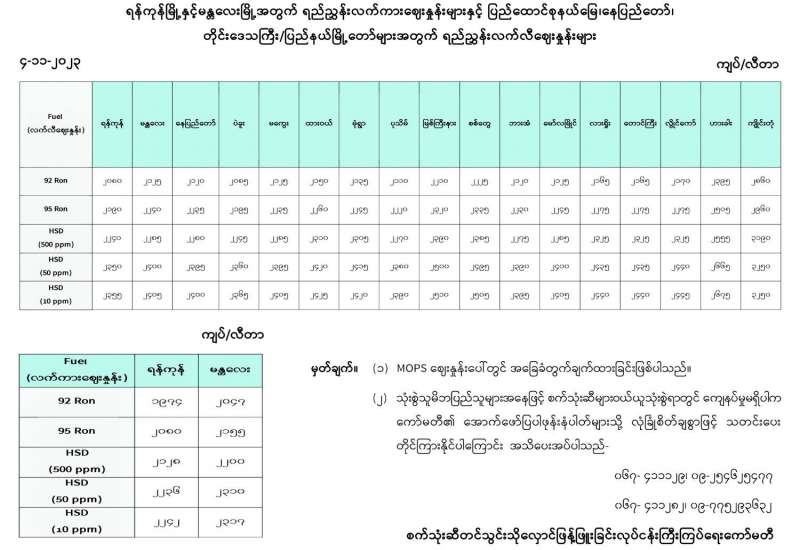 ရန်ကုန်မြို့နှင့် မန္တလေးမြို့အတွက် ရည်ညွှန်းလက်ကားဈေးနှုန်းများနှင့် ပြည်ထောင်စုနယ်မြေ နေပြည်တော်၊ တိုင်းဒေသကြီး/ပြည်နယ် မြို့တော်များအတွက် ရည်ညွှန်းလက်လီဈေးနှုန်းများ