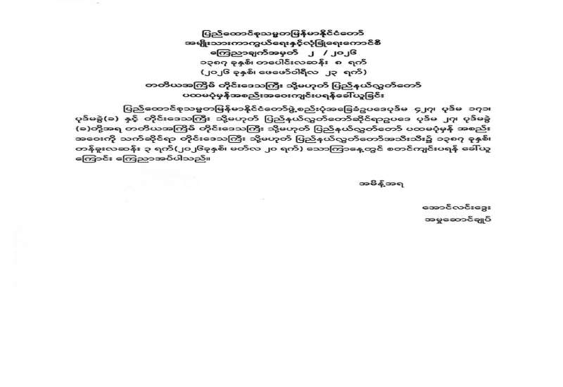 တတိယအကြိမ် တိုင်းဒေသကြီး သို့မဟုတ် ပြည်နယ်လွှတ်တော် ပထမပုံမှန်အစည်းအဝေးတက်ရောက်ရန်အတွက် လွှတ်တော်ကိုယ်စားလှယ်များ သတင်းပို့ကြရန် ထုတ်ပြန်