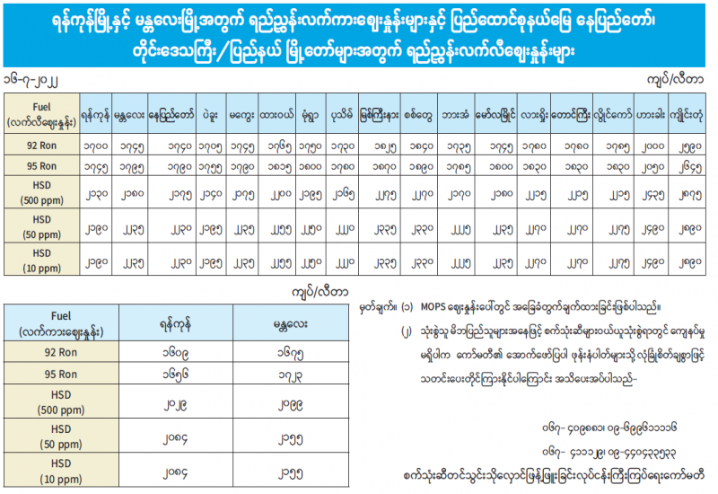 ရန်ကုန်မြို့နှင့် မန္တလေးမြို့အတွက် ရည်ညွှန်းလက်ကား ဈေးနှုန်းများနှင့် ပြည်ထောင်စုနယ်မြေ၊ နေပြည်တော်၊ တိုင်းဒေသကြီး/ ပြည်နယ်မြို့တော်များအတွက် ရည်ညွှန်းလက်လီဈေးနှုန်းများ