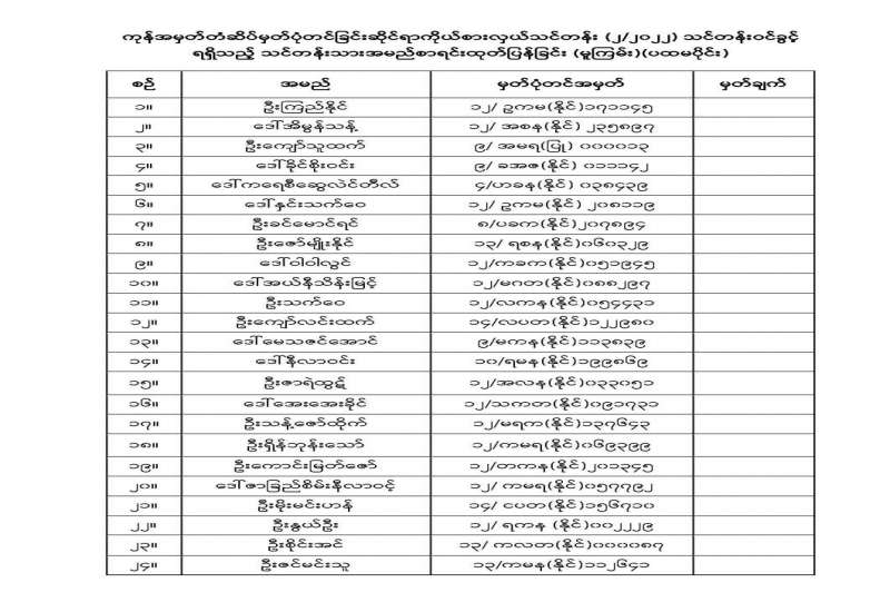 ကုန်အမှတ်တံဆိပ်မှတ်ပုံတင်ခြင်းဆိုင်ရာကိုယ်စားလှယ်သင်တန်း (၂/၂၀၂၂) သင်တန်းဝင်ခွင့် ရရှိသည့် သင်တန်းသားအမည်စာရင်းထုတ်ပြန်ခြင်း (မူကြမ်း)(ပထမပိုင်း)