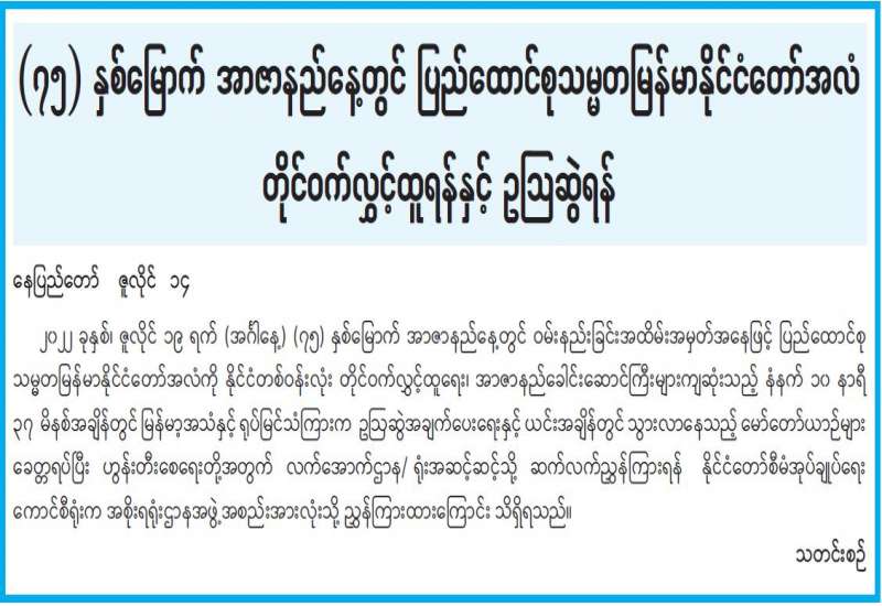 ပြည်ထောင်စုစာရင်းစစ်ချုပ်ရုံး နေပြည်တော်သင်တန်းကျောင်းတွင် ဖွင့်လှစ်သည့် စာရင်းစစ်မှူးများ လုပ်ငန်းစွမ်းဆောင်ရည်မြှင့်တင်ရေး မွမ်းမံသင်တန်း အမှတ်စဉ်(၃၇) သင်တန်းဖွင့်ပွဲ အခမ်းအနားကို ယနေ့နံနက် ၁၀ နာရီခွဲက နေပြည်တော်ရှိ ပြည်ထောင်စုစာရင်းစစ်ချုပ်ရုံး စုပေါင်းခန်းမ၌ ကျင်းပသည်။