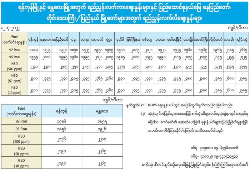 ရန်ကုန်မြို့နှင့် မန္တလေးမြို့အတွက် ရည်ညွှန်းလက်ကားဈေးနှုန်းများနှင့် ပြည်ထောင်စုနယ်မြေ နေပြည်တော်၊ တိုင်းဒေသကြီး/ပြည်နယ် မြို့တော်များအတွက် ရည်ညွှန်းလက်လီဈေးနှုန်းများ