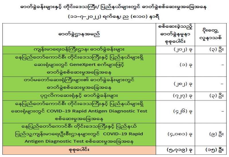 ကျန်းမာရေးဝန်ကြီးဌာနအနေဖြင့် နိုင်ငံအတွင်းကူးစက်ဖြစ်ပွားနေသော COVID-19 ရောဂါ ကာကွယ်၊ ကုသ၊ ထိန်းချုပ်ရေးလုပ်ငန်းများကို အရှိန်အဟုန်မပြတ် ဆောင်ရွက်လျက်ရှိပါသည်။
