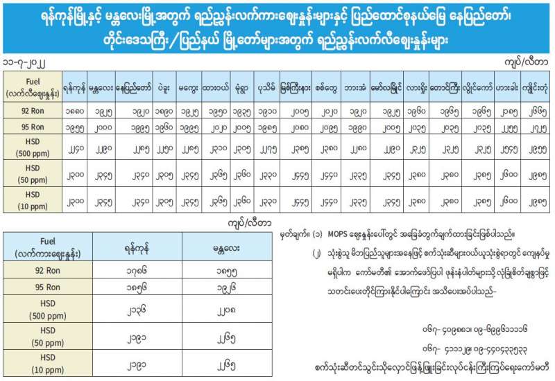 ရန်ကုန်မြို့နှင့် မန္တလေးမြို့အတွက် ရည်ညွှန်းလက်ကားဈေးနှုန်းများနှင့် ပြည်ထောင်စုနယ်မြေ နေပြည်တော်၊ တိုင်းဒေသကြီး/ ပြည်နယ် မြို့တော်များအတွက် ရည်ညွှန်းလက်လီဈေးနှုန်းများ