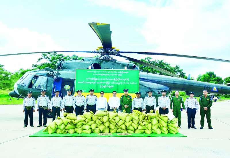 သယံဇာတနှင့် သဘာဝပတ်ဝန်းကျင်ထိန်းသိမ်းရေးဝန်ကြီးဌာနနှင့် ကာကွယ်ရေးဝန်ကြီးဌာနတို့၏ ညှိနှိုင်းစီစဉ်မှုဖြင့် ယနေ့နံနက်ပိုင်းတွင် ပြည်ထောင်စုနယ်မြေ နေပြည်တော်နှင့် ရှမ်းပြည်နယ်တို့အတွင်း သစ်တောပြုန်းတီးနေရာ ငါးနေရာတို့တွင် ရဟတ်ယာဉ်ဖြင့် သစ်စေ့မြေလုံးများ ကြဲချခြင်းကို ပြုလုပ်သည်။