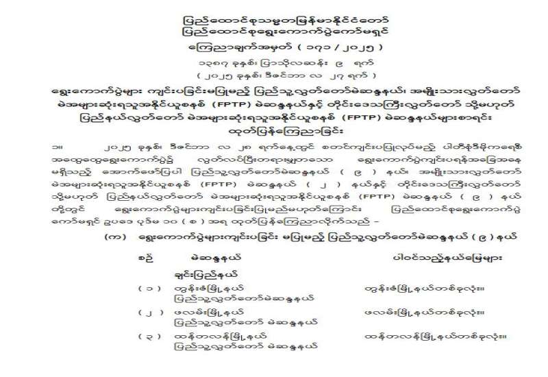 ရွေးကောက်ပွဲများကျင်းပခြင်းမပြုမည့် ပြည်သူ့လွှတ်တော်မဲဆန္ဒနယ်၊ အမျိုးသားလွှတ်တော်မဲအများဆုံးရသူ အနိုင်ယူစနစ် (FPTP) မဲဆန္ဒနယ်နှင့် တိုင်းဒေသကြီးလွှတ်တော် သို့မဟုတ် ပြည်နယ်လွှတ်တော် မဲအများဆုံးရသူ အနိုင်ယူစနစ်(FPTP) မဲဆန္ဒနယ်များစာရင်း ထုတ်ပြန်ကြေညာခြင်း