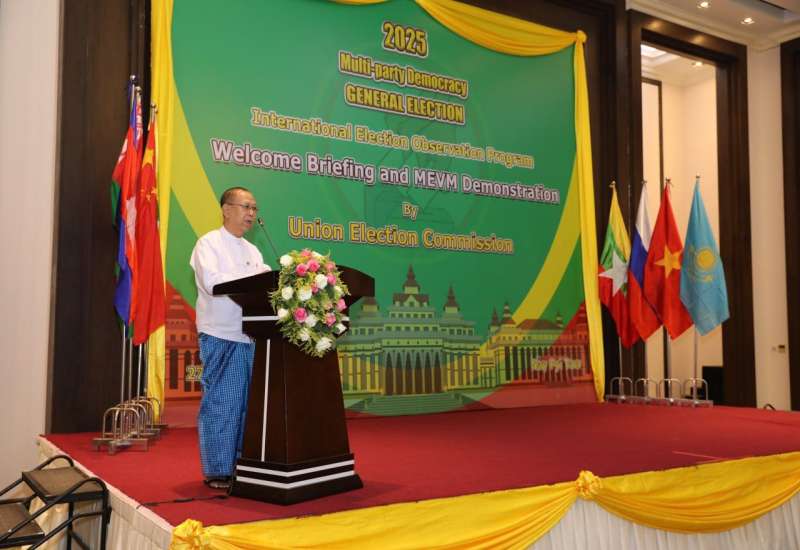 ၂၀၂၅ ခုနှစ် ဒီဇင်ဘာလ ၂၈ ရက်နေ့တွင် စတင်ကျင်းပပြုလုပ်မည့် ပါတီစုံဒီမိုကရေစီအထွေထွေရွေးကောက်ပွဲသို့ လာရောက်လေ့လာကြသည့် နိုင်ငံတကာရွေးကောက်ပွဲစောင့်ကြည့်လေ့လာသူများအား ကြိုဆိုနှုတ်ခွန်းဆက်စကား ပြောကြားခြင်းနှင့် ရွေးကောက်ပွဲဆိုင်ရာ ရှင်းလင်းဆွေးနွေးခြင်းအခမ်းအနားကို ယနေ့မွန်းလွဲ ၁၃:၀၀ နာရီတွင် နေပြည်တော်ရှိ Jasmine Nay Pyi Taw ဟိုတယ်၌ ကျင်းပပြုလုပ်ရာ ပြည်ထောင်စုရွေးကောက်ပွဲကော်မရှင်ဥက္ကဋ္ဌ ဦးသန်းစိုးတက်ရောက်၍ အမှာစကားပြောကြားသည်။
