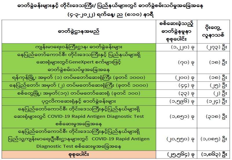 ကျန်းမာရေးဝန်ကြီးဌာနအနေဖြင့် နိုင်ငံအတွင်း ကူးစက်ဖြစ်ပွားနေသော COVID-19 ရောဂါ ကာကွယ်၊ ကုသ၊ ထိန်းချုပ်ရေးလုပ်ငန်းများကို အရှိန်အဟုန်မြှင့် ဆောင်ရွက်လျက်ရှိပါသည်။