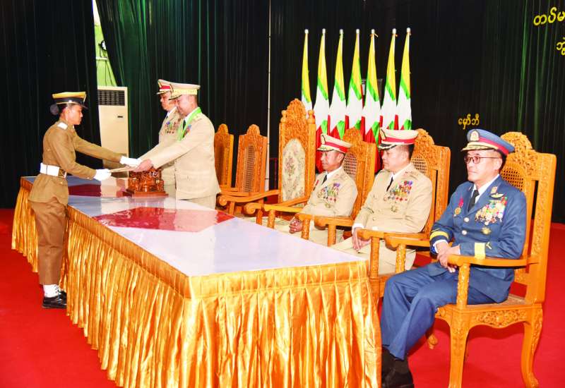 တပ်မတော်(ကြည်း)ဗိုလ်သင်တန်းကျောင်း(မှော်ဘီ)၊ ဘွဲ့ရအမျိုးသမီး ဗိုလ်လောင်းသင်တန်းအမှတ်စဉ်(၁၂) သင်တန်းဆင်းဂုဏ်ပြုညစာစားပွဲအခမ်းအနားကို ယနေ့ညနေပိုင်းတွင် ရန်ကုန်မြို့၊ တပ်မတော်(ကြည်း) ဗိုလ်သင်တန်းကျောင်း(မှော်ဘီ)ရှိ ပြည်ထောင်စုခန်းမ၌ကျင်းပရာ နိုင်ငံတော်လုံခြုံရေးနှင့် အေးချမ်းသာယာရေးကော်မရှင်ဥက္ကဋ္ဌ တပ်မတော်ကာကွယ်ရေးဦးစီးချုပ် ဗိုလ်ချုပ်မှူးကြီးမင်းအောင်လှိုင် တက်ရောက်ချီးမြှင့်သည်။