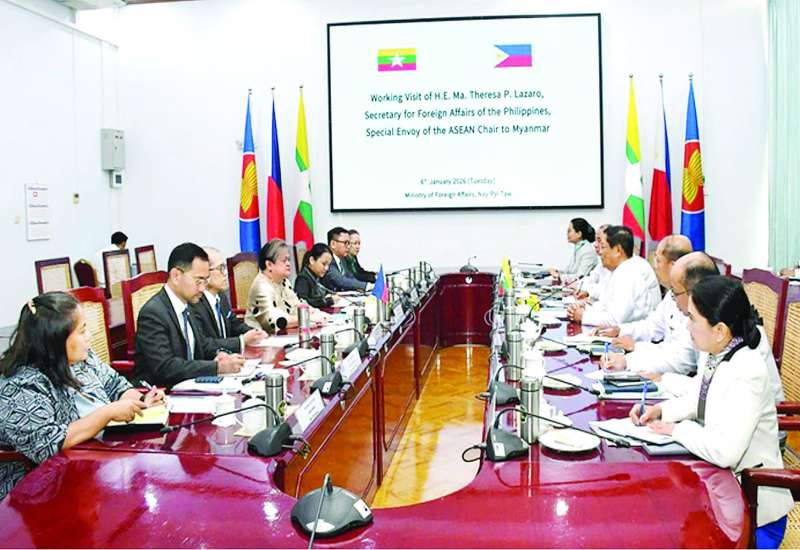 နိုင်ငံခြားရေးဝန်ကြီးဌာန ပြည်ထောင်စုဝန်ကြီး ဦးသန်းဆွေသည် ဇန်နဝါရီ ၅ ရက်မှ ၇ ရက်အထိ မြန်မာနိုင်ငံသို့ အလုပ်သဘောခရီးစဉ် လာရောက်သည့် အာဆီယံဥက္ကဋ္ဌ၏ မြန်မာနိုင်ငံဆိုင်ရာ အထူးကိုယ်စားလှယ် ဖိလစ်ပိုင်နိုင်ငံခြားရေးဝန်ကြီး H.E. Ms. Maria Theresa Parreno Lazaro ဦးဆောင်သည့် ကိုယ်စားလှယ်အဖွဲ့အား ယနေ့တွင်နေပြည်တော်ရှိ နိုင်ငံခြားရေးဝန်ကြီးဌာန၌ တွေ့ဆုံသည်။