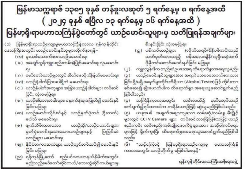 မြန်မာသက္ကရာဇ် ၁၃၈၅ ခုနှစ် တန်ခူးလဆုတ် ၅ ရက်နေ့မှ ၈ ရက်နေ့အထိ (၂၀၂၄ ခုနှစ် ဧပြီလ ၁၃ ရက်နေ့မှ ၁၆ ရက်နေ့အထိ) မြန်မာ့ရိုးရာမဟာသင်္ကြန်ပွဲတော်တွင် ရန်ကုန်မြို့တော်ခန်းမရှေ့ရှိ ရန်ကုန်မြို့တော်မဟာသင်္ကြန်မဏ္ဍပ်၌ ရေကစားခြင်း၊ သင်္ကြန်ယိမ်းအကအလှ ဖျော်ဖြေခြင်းများဖြင့် ကျင်းပသွားမည်ဖြစ်၍ မဟာဗန္ဓုလလမ်းအား ဆူးလေဘုရားလမ်းမှ ပန်းဆိုးတန်းလမ်းအထိ လည်းကောင်း၊ ဆူးလေဘုရားလမ်းအား အနော်ရထာလမ်းမှ ကုန်သည်လမ်းအထိလည်းကောင်း နံနက် ၀၇၀၀ အချိန်မှ ညနေ ၁၈၀၀ အချိန်အထိ ခေတ္တလမ်းပိတ်ထားမည်ဖြစ်ရာ မော်တော်ယာဉ် မောင်းနှင်သူများအနေဖြင့် လမ်းလွှဲများမှ သွားလာမောင်းနှင်ကြပါရန် အသိပေးနှိုးဆော်အပ်ပါသည်။