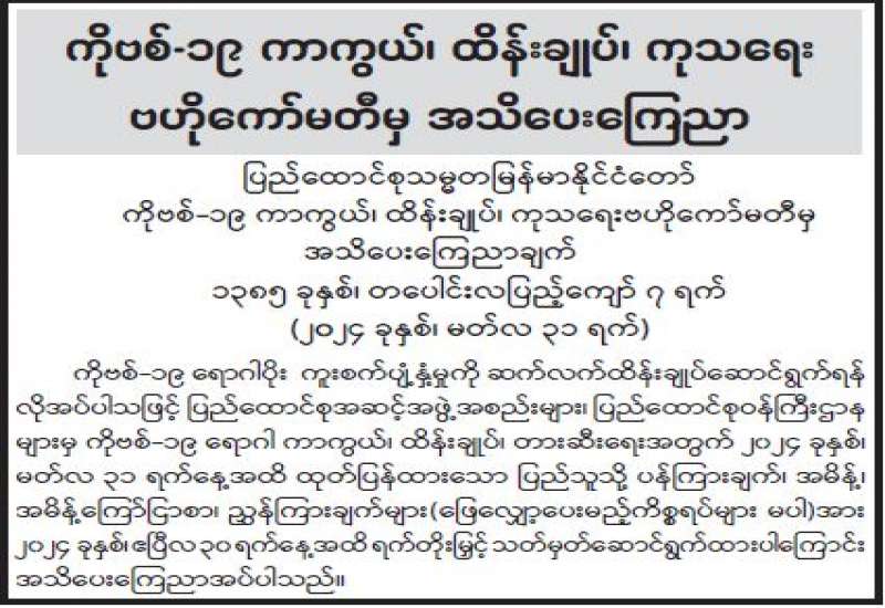 ကိုဗစ်-၁၉ ကာကွယ်၊ ထိန်းချုပ်၊ ကုသရေးဗဟိုကော်မတီမှ အသိပေးကြေညာ
