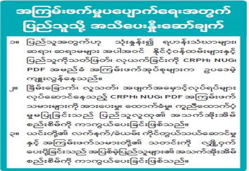 အကြမ်းဖက်အုပ်စုအဖြစ် ကြေညာထားသော CRPH ၊ NUG နှင့် ယင်းတို့၏ လက်ဝေခံအဖွဲ့အစည်းများ၊ ယင်းတို့နှင့်ဆက်နွှယ်နေသော အဖွဲ့အစည်းများ၊ လူပုဂ္ဂိုလ်များသည် နိုင်ငံတော် တည်ငြိမ်အေးချမ်းရေးကို ပျက်ပြားစေရန်နှင့် ပြည်သူလူထုကို အကြောက်တရားများဖြစ်ပေါ်စေပြီး အစိုးရယန္တရားများ ပျက်ပြားစေရန် ရည်ရွယ်လျက် လှုံ့ဆော်ခြင်း၊ ဝါဒဖြန့်ခြင်း၊ ခြိမ်းခြောက်ခြင်းများကို လူမှုကွန်ရက်များမှတစ်ဆင့် နည်းမျိုးစုံဖြင့် ပြုလုပ်လျက်ရှိပါသည်။