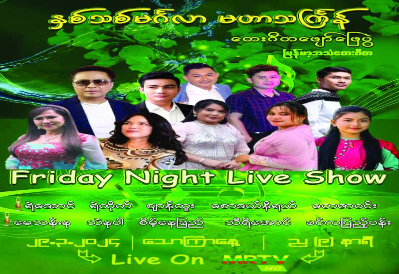 မြန်မာ့အသံနှင့်ရုပ်မြင်သံကြားအနေဖြင့် Friday Night Live Show တေးဂီတဖျော်ဖြေပွဲများကို ဆန်းသစ်တင်ဆက်ပေးလျက်ရှိရာ ၁၃၈၅ ခုနှစ် မြန်မာ့ရိုးရာ မဟာသင်္ကြန်ပွဲတော်တွင် ပြည်သူများ ပျော်ရွှင်စွာ ပါဝင်ဆင်နွှဲနိုင်ရန် နှိုးဆော်သည့်အနေဖြင့် “နှစ်သစ်မင်္ဂလာမဟာသင်္ကြန်” တေးဂီတဖျော်ဖြေပွဲကို မတ် ၂၉ ရက် (သောကြာနေ့) ည ၉ နာရီခန့်တွင် မြန်မာ့အသံနှင့် ရုပ်မြင်သံကြား၏ MRTV-HD Channel မှ တိုက်ရိုက်ထုတ်လွှင့်ပြသမည်ဖြစ်သည်။