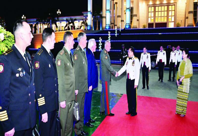 နိုင်ငံတော်စီမံအုပ်ချုပ်ရေးကောင်စီဥက္ကဋ္ဌ တပ်မတော်ကာကွယ်ရေးဦးစီးချုပ် ဗိုလ်ချုပ်မှူးကြီး မင်းအောင်လှိုင်နှင့်ဇနီး ဒေါ်ကြူကြူလှတို့က တည်ခင်းဧည့်ခံသည့် ၂၀၂၄ ခုနှစ်၊ (၇၉)နှစ်မြောက် တပ်မတော်နေ့အထိမ်းအမှတ်အကြို ဂုဏ်ပြုညစာစားပွဲ အခမ်းအနားကို ယနေ့ညပိုင်းတွင် နေပြည်တော်ရှိ ဇေယျာသီရိဗိမာန် ဥပစာရင်ပြင်၌ ကျင်းပပြုလုပ်သည်။