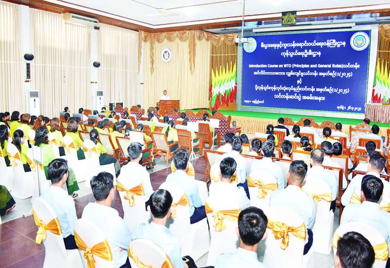 စီးပွားရေးနှင့် ကူးသန်းရောင်းဝယ်ရေးဝန်ကြီးဌာနမှ ကြီးမှူးကျင်းပသော ကမ္ဘာ့ကုန်သွယ်ရေးအဖွဲ့ဆိုင်ရာ မိတ်ဆက်သင်တန်း Introduction Course on WTO (Principles and General Rules)၊ အင်္ဂလိပ်ဘာသာ စကားကျွမ်းကျင်မှုသင်တန်း အမှတ်စဉ် (၁/၂၀၂၄)နှင့် ပို့ကုန်သွင်းကုန်လုပ်ထုံးလုပ်နည်းသင်တန်း အမှတ်စဉ် (၁/၂၀၂၄) သင်တန်းဆင်းပွဲများကို နေပြည်တော်ရုံးအမှတ်-၃ ၌ ယနေ့မွန်းလွဲ၂ နာရီက ကျင်းပသည်။