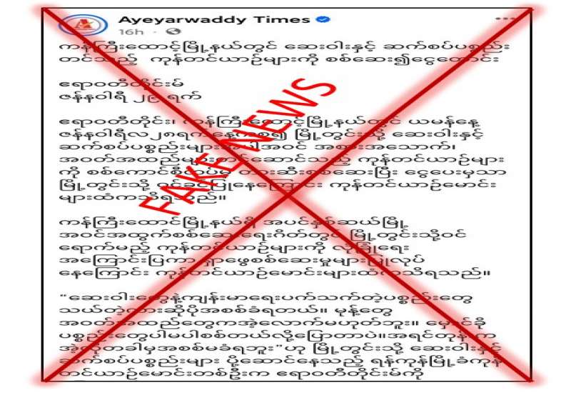 ဧရာဝတီတိုင်းဒေသကြီး၊ ကန်ကြီးထောင့်မြို့နယ်တွင် ဇန်နဝါရီလ၂၈ ရက်နေ့မှစ၍ မြို့တွင်းသို့ ဆေးဝါးနှင့် ဆက်စပ်ပစ္စည်းများအပါအဝင် အစားအသောက်၊ အဝတ်အထည်များ တင်ဆောင်သည့် ကုန်တင်ယာဉ်များကို လုံခြုံရေးတပ်ဖွဲ့ဝင်များမှ တားဆီးစစ်ဆေးပြီး ကုန်တင်ယာဉ် တစ်စီးလျင် ငါးသောင်းကျပ်မှ ရှစ်သောင်းကျပ်အထိ ငွေပေးမှသာ မြို့တွင်းသို့ ဝင်ခွင့်ပြုသည်ဟု မဟုတ်မမှန်သတင်းများကို လူမှုကွန်ရက်ပေါ်တွင် ရေးသားဖြန့်ဝေနေသည်ကို တွေ့ရှိရသည်။