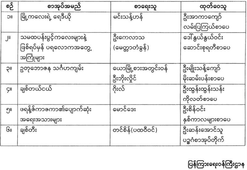 ၂၀၁၄ ခုနှစ်၊ ပုံနှိပ်ခြင်းနှင့်ထုတ်ဝေခြင်းလုပ်ငန်းဥပဒေ၊ နည်းဥပဒေများအရ ထုတ်ဝေသူများသည် မိမိတို့ထုတ်ဝေသည့် စာအုပ်စာစောင် ၅ အုပ် သို့မဟုတ် ၅ စောင်ကို ပြန်ကြားရေးဝန်ကြီးဌာနသို့ အဖိုးအခလွတ်ပေးအပ်ရမည်ဖြစ်ပါသည်။ ပြန်ကြားရေးဝန်ကြီးဌာနသည် အဆိုပါစာအုပ်စာစောင်များကို မူပိုင်ခွင့်နှင့်စာအုပ်စာရင်း ၂ အုပ်၊ အမျိုးသားစာပေဆု စိစစ်ရွေးချယ်ရေးကော်မတီသို့ ၂ အုပ်နှင့် အမျိုးသားမှတ်တမ်းများ မော်ကွန်းတိုက်ဦးစီးဌာနသို့ ၁ အုပ် ပေးပို့လျက်ရှိပါသည်။