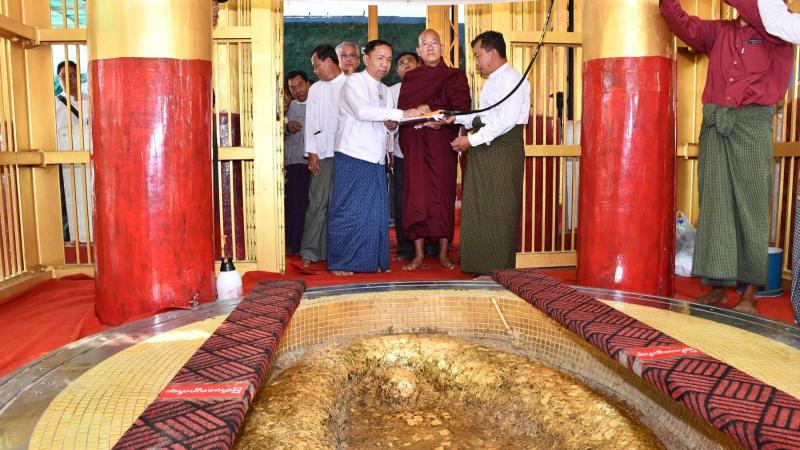 ဧရာဝတီတိုင်းဒေသကြီးဝန်ကြီးချုပ်သည် မြတ်မော်တင်စွန်းစေတီတော်ကုန်းမြေအောက်ခြေအား ပင်လယ်ရေလှိုင်းရိုက်ခတ်မှုမှကာကွယ်ရန် ဆောင်ရွက်ထားသည့် ကျောက်စီလှိုင်းကာအာကြည့်ရှုစစ်ဆေး