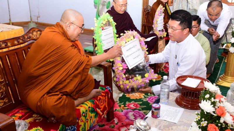 ဧရာဝတီတိုင်းဒေသကြီးဝန်ကြီးချုပ် အင်္ဂပူမြို့နယ်၊ ကွင်းကောက်တောင်ကျေးရွာအုပ်စုတွင် တည်ထားကိုးကွယ်တော်မူမည့် ဝိဇယသိဒ္ဓိကျောက်စိမ်းစေတီတော် ဘက်စုံတည်ဆောက်ရေးလုပ်ငန်းများအတွက် အလှူငွေပေးအပ်ပွဲအခမ်းအနား တက်ရောက်