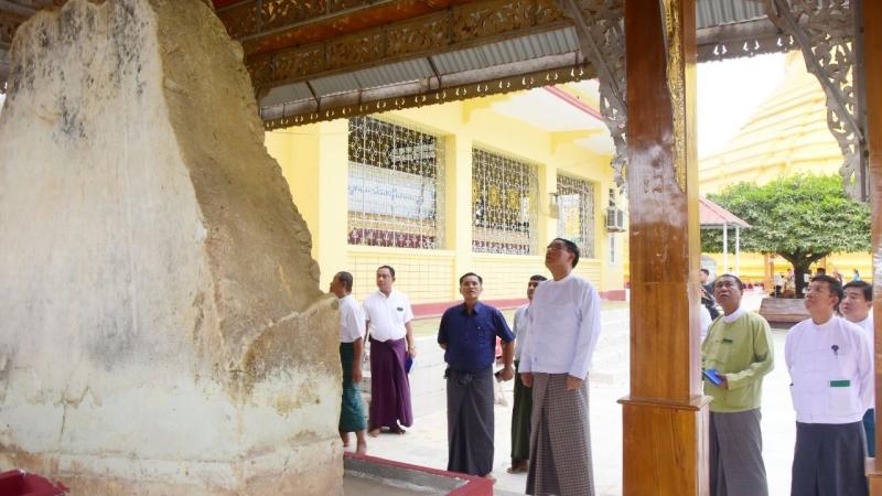 ဧရာဝတီတိုင်းဒေသကြီးဝန်ကြီးချုပ်သည် မြတ်မော်တင်စွန်းစေတီတော်ကုန်းမြေအောက်ခြေအား ပင်လယ်ရေလှိုင်းရိုက်ခတ်မှုမှကာကွယ်ရန် ဆောင်ရွက်ထားသည့် ကျောက်စီလှိုင်းကာအာကြည့်ရှုစစ်ဆေး
