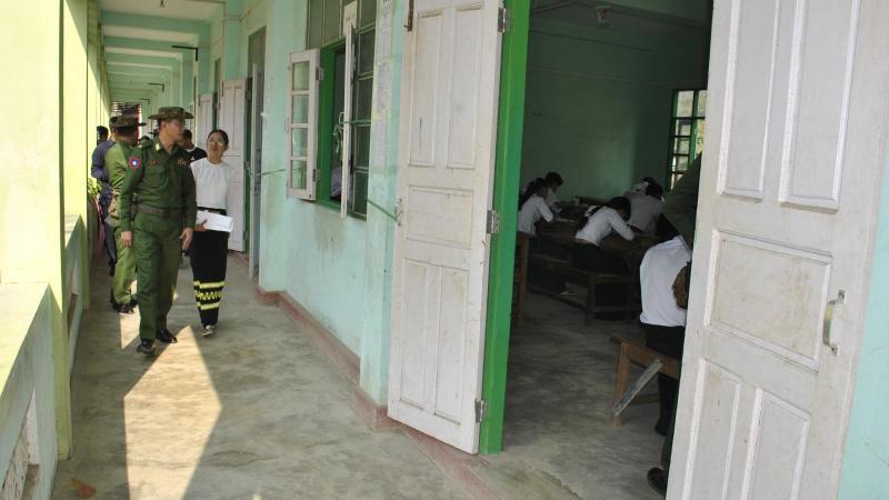 မတ္တရာမြို့နယ်၌ ဓါတုဗေဒဘာသာရပ်နှင့် ပထဝီဝင်ဘာသာရပ် အေးချမ်းစွာဖြေဆိုပြီးစီး အလယ်ပိုင်းတိုင်းစစ်ဌာနချုပ်တိုင်းမှူး ဗိုလ်မှူးချုပ်အောင်ဌေးမှ စာမေးပွဲဖြေဆိုနေမှုအား ကြည့်ရှုစစ်ဆေး