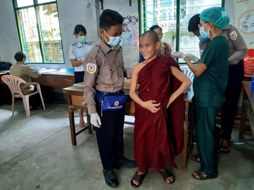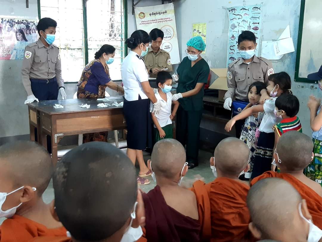 “ကျောင်းနေအရွယ်ကလေးတိုင်း ကျန်းမာပျော်ရွှင်စွာပညာသင်ကြားနိုင်ဖို့ ကိုဗစ်- ၁၉ရောဂါကာကွယ်ဆေး ထိုးကြပါစို့” ဆောင်ပုဒ်နှင့်အညီ ကိုဗစ်-၁၉ ရောဂါကာကွယ်ထိန်းချုပ် ကုသရေးဆောင်ရွက်ရာတွင် ကာကွယ်ဆေးထိုးနှံခြင်းသည် အဓိကအခန်းကဏ္ဍတွင်ပါဝင်သည့် လုပ်ငန်းတစ်ခုဖြစ်သောကြောင့် ကျောင်းသား၊ကျောင်းသူများ ကိုဗစ်-၁၉ ရောဂါကူးစက်မှု ကာကွယ်နိုင်ရေးအတွက် ရန်ကုန်အနောက်ပိုင်းခရိုင်၊ မရမ်းကုန်းမြို့နယ်အတွင်းရှိ ဘုန်တော်ကြီးသင်ပညာရေးကျောင်းများဖြစ်သည့် ပိတောက်ရွှေဝါကျောင်းနှင့် ပညာသိပ္ပံကျောင်းများ ရှိအသက် (၅) နှစ်မှ (၁၂) နှစ်ထိသံဃာတော်များ၊သီလရှင်များ ကျောင်းသား၊ ကျောင်းသူ စုစုပေါင်း(၃၀၄)ဦးအား ကိုဗစ်-၁၉ ရောဂါကာကွယ်ဆေး (Sinophram)ကို ယမန်နေ့ နံနက် ၁၀ နာရီကကျောင်းများရှိ သတ်မှတ်စုရပ်များတွင် ဒုတိယအကြိမ်ထိုးနှံ ပေးလျက်ရှိကြောင်း သိရသည်။