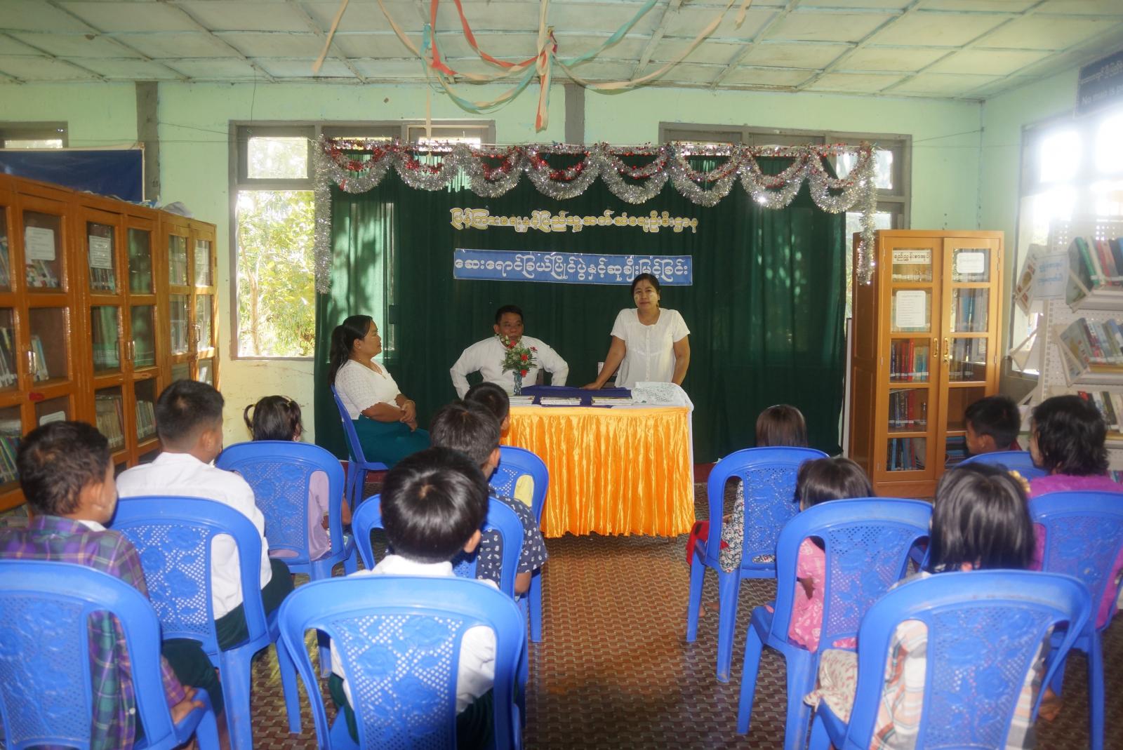 ထို့နောက် ဦးစီးအရာရှိ ဦးစန်းဝင်းနှင့် ဒုတိယဦးစီးမှူး ဒေါ်ခင်မျိုးတင်တို့က ကျောင်းသား၊ ကျောင်းသူများအား အားလပ်ချိန်တွင် စာကြည့်တိုက်သို့ လာရောက်၍ စာပေလေ့လာ ဖတ်ရှုကြရန်၊ စာပေမှအသိပညာဗဟုသုတများ ရရှိ၍ ဘက်စုံဖွံ့ဖြိုးတိုးတက်ကြရန် ဆွေးနွေး ဟောပြောခဲ့ပြီး ပြုင်ပွဲတွင်ဆုရရှိသူများအား ဦးစီးအရာရှိ ဦးစန်းဝင်းက ဆုများချီးမြှင့်ကာ ပြိုင်ပွဲဝင်များအား ဗလာစာအုပ်များ ပေးအပ်ခဲ့ကြောင်း သိရှိရသည်။