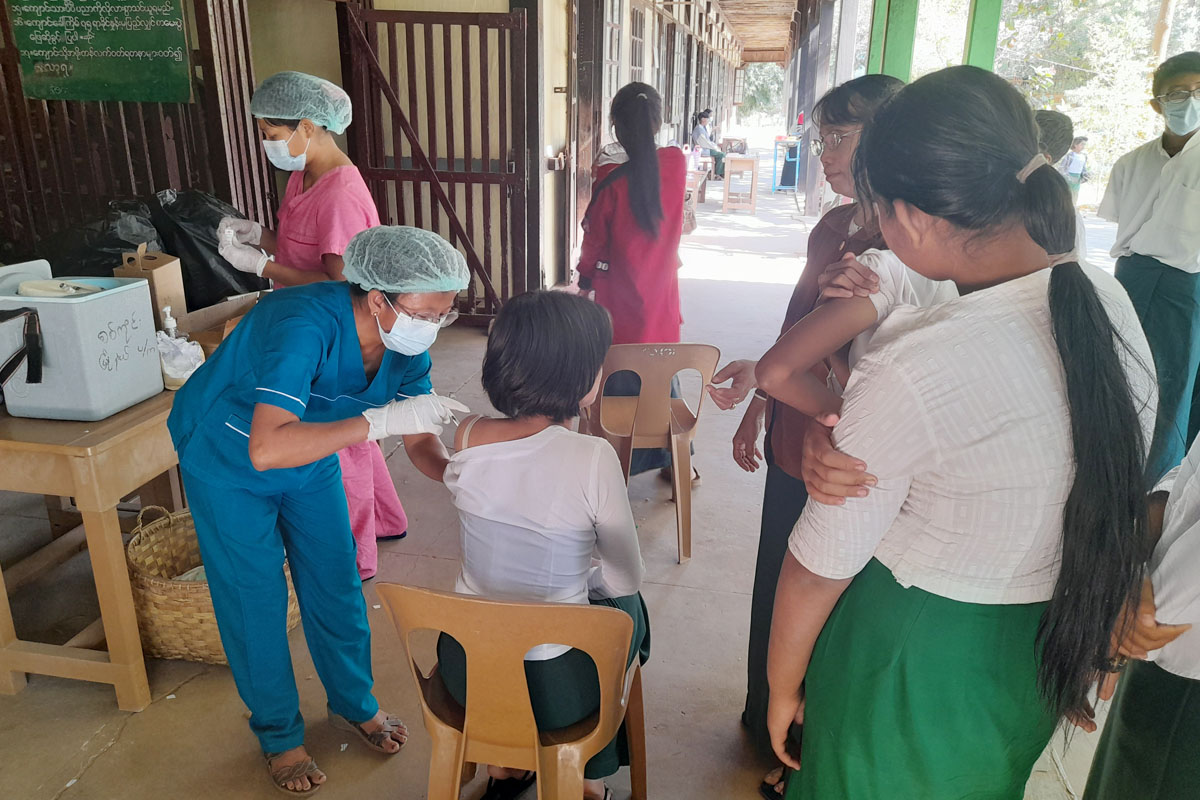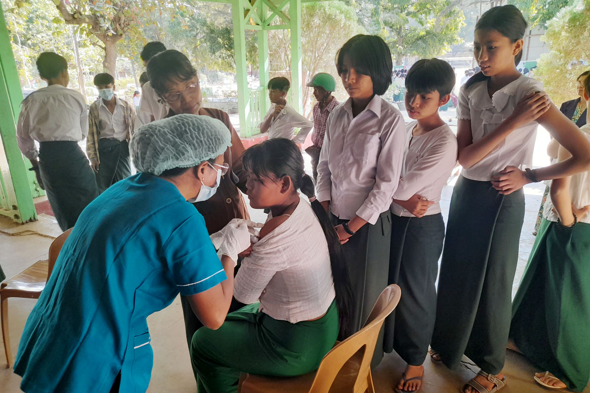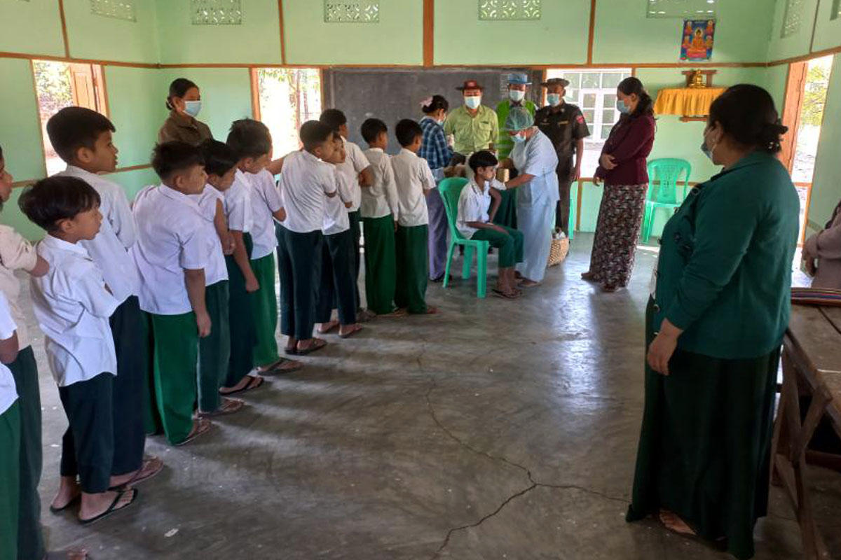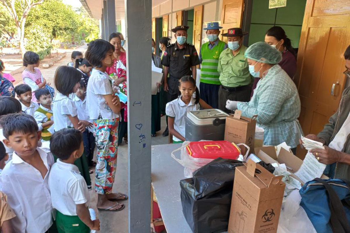ထပ်ဆောင်းကာကွယ်ဆေး (Booster Does) ထိုးနှံဆောင်ရွက်မှုများကို မြို့နယ်စီမံအုပ်ချုပ်ရေးအဖွဲ့၏ ဦးဆောင် လမ်းညွှန်မှုဖြင့် မြို့နယ်ပြည်သူ့ကျန်းမာရေးဦးစီးဌာနနှင့်ပညာရေးဌာနတို့ ပူးပေါင်း၍ အမှတ် (၁)အခြေခံပညာအထက်တန်းကျောင်း၊ အမှတ်(၂) အခြေခံပညာအထက်တန်းကျောင်း၊ မြို့ရှေ့ အခြေခံပညာအထက်တန်းကျောင်း၊ လေးရွာအခြေခံပညာ အထက်တန်းကျောင်းနှင့် ရွာလုအခြေခံပညာ အထက်တန်းကျောင်း(ခွဲ)တို့တွင် စုရပ်များဖွင့်လှစ်ထိုးနှံပေးခြင်းဖြစ်ကြောင်းသိရသည်။ အဆိုပါ အသက်(၅)နှစ်မှ (၁၂)အတွင်းရှိ ကျောင်း သား၊ကျောင်းသူလေးများအား ထပ်ဆောင်ကာကွယ်ဆေးထိုးနှံခြင်း ကို(၉-၁-၂၀၂၃)ရက်နေ့မှ (၁၀-၂-၂၀၂၃)ရက်နေ့အထိ ဆေးထိုးကာလ သတ်မှတ်ဆောင်ရွက်ပေးသွားမည်ဖြစ်ကြောင်း မြို့နယ် ကိုဗစ်-၁၉ ထိန်းချုပ်ရေးနှင့်အရေးပေါ်တုံ့ပြန်ရေးကော်မတီထံမှ သိရပြီး၊ ဆေးထိုးရမည့် ရည်မှန်းကျောင်းသားဦးရေ စုစုပေါင်းမှာ(၅၅၅၀)ဦးဖြစ်၍ (၉-၁-၂၀၂၃)ရက်နေ့တွင် ဆေးထိုးစုရပ်(၅)ခု၌ ကျောင်းသားကျောင်းသူ စုစုပေါင်း(၃၅၅)ဦး လာရောက် ထိုးနှံခဲ့ကြကြောင်းသိရသည်။