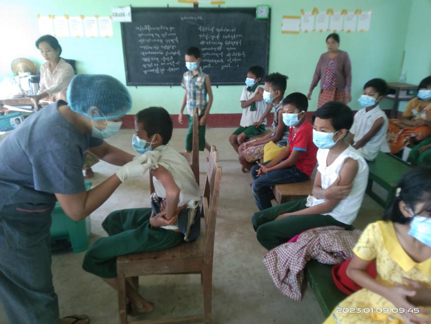 ကိုဗစ်-၁၉ရောဂါ ကာကွယ်ထိန်းချုပ်ရေးလုပ်ငန်းများ ဆောင်ရွက်ရာတွင် ကာကွယ်ဆေးထိုးနှံခြင်းသည် အဓိကအခန်းကဏ္ဍတွင် ပါဝင်သည့်အတွက် ကျောင်းသား၊ ကျောင်းသူများ ကိုဗစ်-၁၉ရောဂါ ကူးစက်မှုကာကွယ်နိုင်ရေးအတွက် မြို့နယ်ကျန်းမာရေးဦးစီးဌာနမှ မြို့နယ်ဆရာဝန်ကြီး ဒေါက်တာကျော်မိုးကြီးကြပ်မှုဖြင့် ကျန်းမာရေးဝန်ထမ်းများက အသက်(၅)နှစ်မှ(၁၂)နှစ်ထိ ကျောင်းသား၊ ကျောင်းသူများအား ကိုဗစ်-၁၉ ထပ်ဆောင်းကာကွယ်ဆေး (Booster Dose)ကို ထိုးနှံပေးခဲ့သည်။