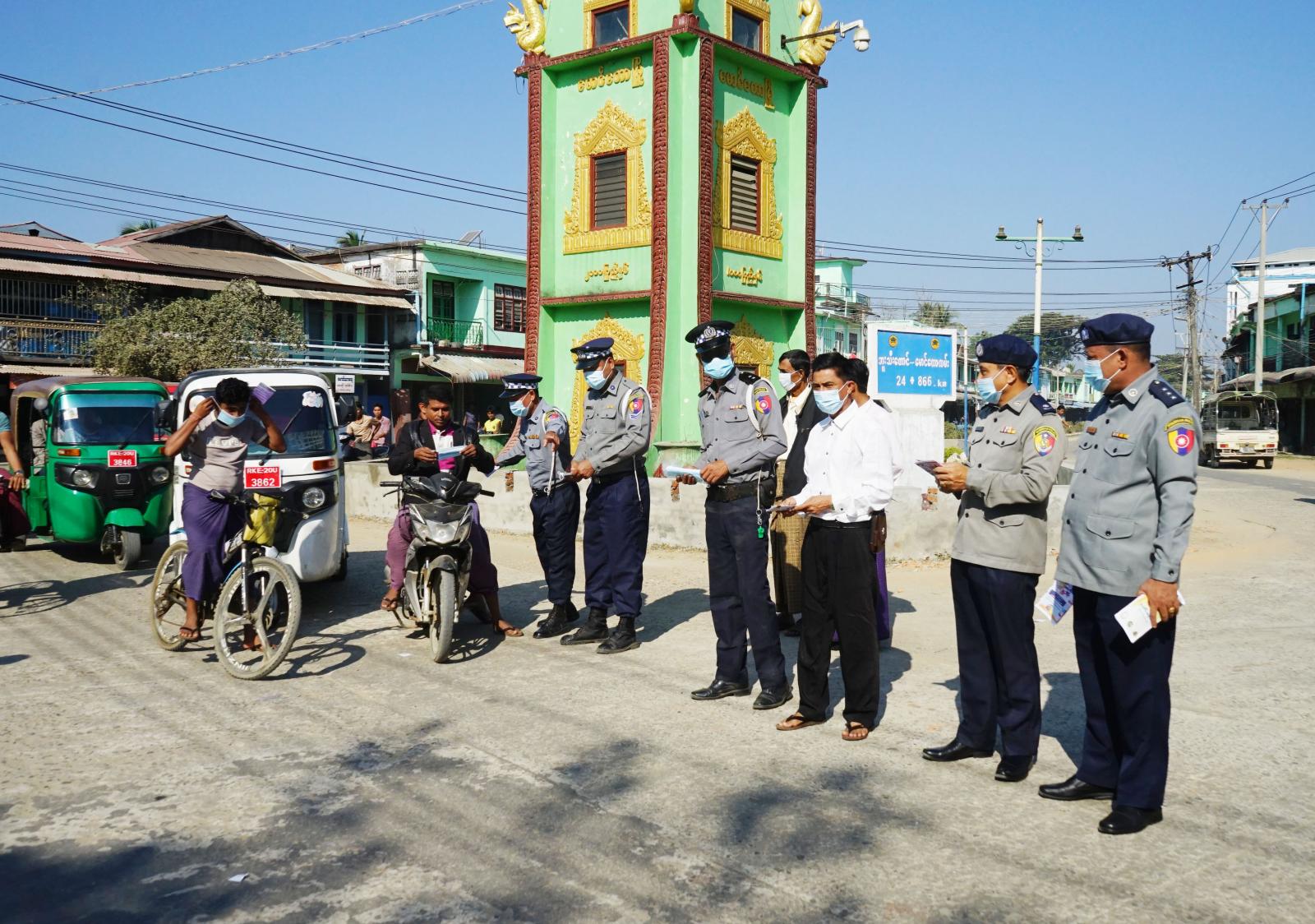 ထိုသို့ ဆောင်ရွက်ရာတွင် အမှတ်(၄၆) မူးယစ်တပ်ဖွဲ့စုမှူး ရဲမှူးမြင့်သောင်း၊ မြို့မရဲစခန်းမှူး ဒုတိယရဲမှူး ထွန်းနိုင်၊ မြို့မရဲစခန်း ဒုတိယစခန်းမှူး ယာဉ်/လမ်းစည်း ကမ်းထိန်းသိမ်းရေး တပ်ဖွဲ့စုမှ ရဲအုပ်သန့်ဇင်လင်း၊ ယာဉ်ထိန်းတပ်ဖွဲ့ဝင်များ၊ ရဲတပ်ဖွဲ့ဝင်များနှင့် တာဝန်ရှိသူ များက အများပြည်သူသိရှိ လိုက်နာနိုင်စေရေးအတွက် အသိပညာပေးလက်ကမ်းစာစောင်များ ဖြန့်ဝေပေးခဲ့ကြပြီး အဆိုပါ အသိပညာပေး လက်ကမ်းစာစောင်တွင် မူးယစ်ဆေးဝါးပပျောက်ရေးနှင့် မူးယစ်ဆေးဝါးနှင့် ပတ်သတ်၍ ဆိုးကျိုးများ၊ သုံးစွဲသည့်အကြောင်းအရင်းများ၊ မူးယစ်ဆေးဝါးအမျိုးအစားများ၊ မူးယစ်ဆေးဝါးသုံးစွဲပြီး ရုပ်ပိုင်းဆိုင်ရာ၊ စိတ်ပိုင်းဆိုင်ရာ၊ လူမှုရေးပိုင်ဆိုင်ရာ ထိခိုက်မှုများ၊ ပုဒ်မ၊ ပြစ်မှု၊ ပြစ်ဒဏ်များ၊ ယာဉ်/လမ်းစည်းကမ်းများနှင့် ပတ်သတ်၍ ယာဉ်မောင်းနှင်သူ ပြည်သူများအနေဖြင့် ခိုင်ခံ့ကောင်းမွန်သည့် ဆိုင်ကယ်စီးဦးထုပ်များဆောင်းကြရန် မော်တော်ယာဉ်မောင်းနှင်သူများထိုင်ခုံခါးပတ် တပ်ဆင်ကြရန်နှင့် ယာဉ်စည်းကမ်းလမ်းစည်းကမ်းများ လိုက်နာကြရန် ယာဉ်မောင်းနှင်းသူများ၊ လမ်းသွား၊ လမ်းလာပြည်သူများ သိရှိလိုက်နာ ဆောင်ရွက်ရမည့်အချက်များအား အသိပညာပေးပြောကြားပြီး လက်ကမ်း စာစောင် ၂၀၀ စောင်နှင့် နှာခေါင်းစည်း Mask များကို လည်း ဖြန့်ဝေပေးခဲ့ကြကြောင်းသိရသည်။