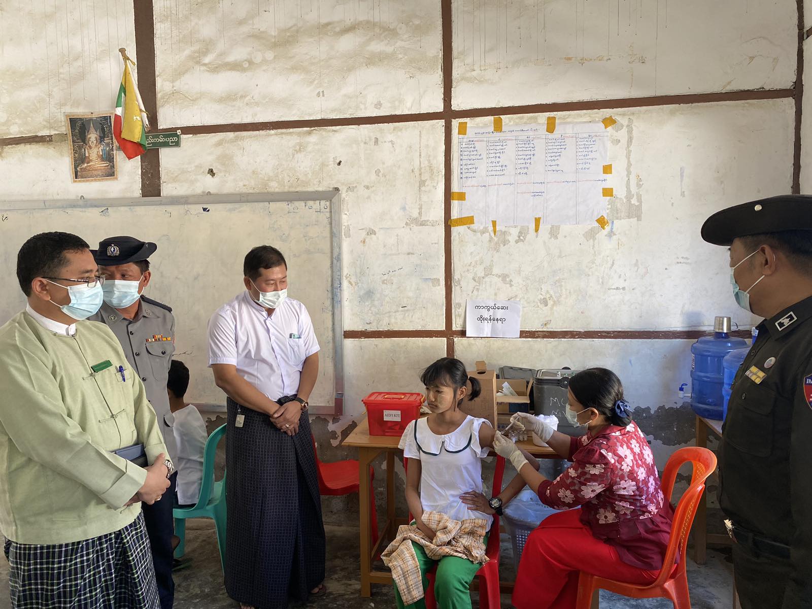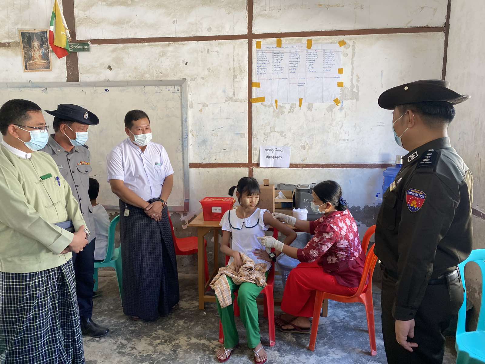 ဆက်လက်၍ အလယ်စုရပ်ကွက်ရှိ မြို့မအထက(ခွဲ) ကျောင်း၌ အသက်(၅)နှစ်မှ (၁၂)နှစ်အတွင်းရှိ ကျောင်းသား/သူများအား ကိုဗစ်-၁၉ ကာကွယ်ဆေး (Booster)ထိုးနှံပေး နေမှုအခြေအနေများကို သွားရောက်ကြည့်ရှုအားပေးခဲ့ကြောင်း သိရသည်။