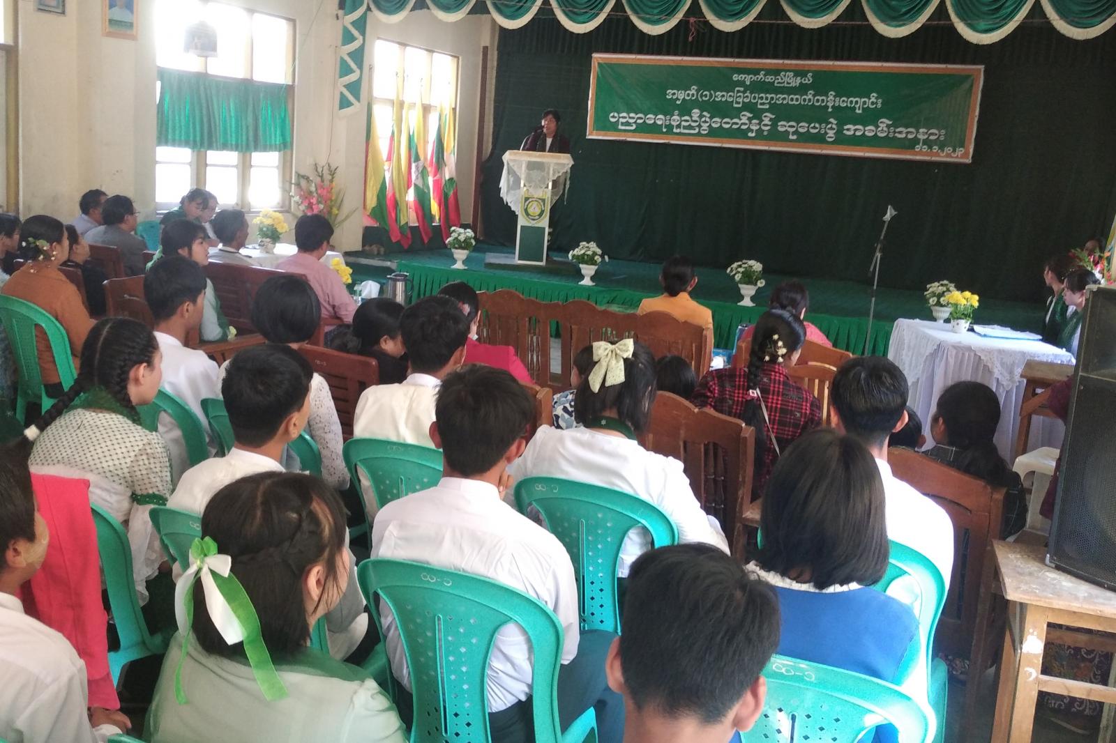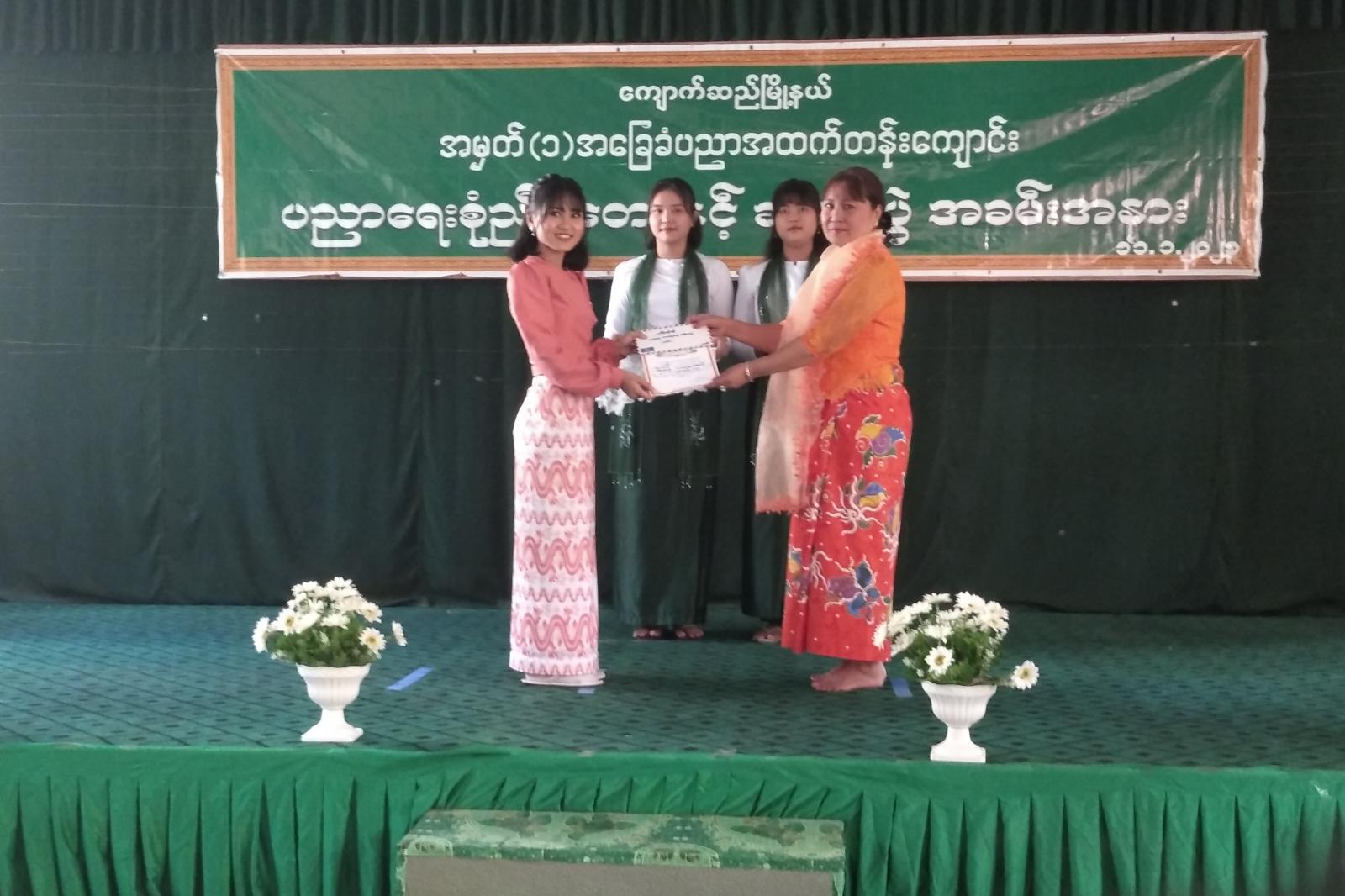 အခမ်းအနားကို အမှတ်(၁) အခြေခံပညာ အထက်တန်းကျောင်းမှ ကျောင်းသား၊ ကျောင်းသူများက စုံညီပွဲတော်တို့နွှဲပျော် သီချင်းဖြင့် သီဆိုဖျော်ဖြေဖွင့်လှစ်ခဲ့ပြီး ခရိုင်ပညာရေးမှူး ဒေါက်တာဥမ္မာကြည်က ယနေ့အခမ်းအနားတွင် ထူးချွန်ထက်မြက်သော ကျောင်းသား/ကျောင်းသူများအား ဆုများ ပေးအပ်ချီးမြှင့်သွားမည်ဖြစ်သဖြင့် ဆက်လက်ကြိုးစားကြစေလိုကြောင်း အမှာစကား ပြောကြားပြီး ဒုတိယမြို့နယ်ပညာရေးမှူး ဦးညွှန့်ဝင်းနှင့်အတူ ၂၀၂၂၁-၂၀၂၂ ပညာသင်နှစ် တက္ကသိုလ်ဝင်တန်းတွင် (၆)ဘာသာ ဂုဏ်ထူးဖြင့် အောင်မြင်ခဲ့သော ကျောင်းသားမောင်အောင်ဖြိုးသူနှင့် လူရည်ချွန်ဆုရ ကျောင်းသား/ကျောင်းသူများအား ဆုများချီးမြှင့်ခဲ့သည်။